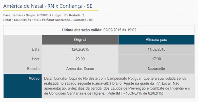 alteração na data se deu para conciliar as rodadas da Copa do Nordeste e